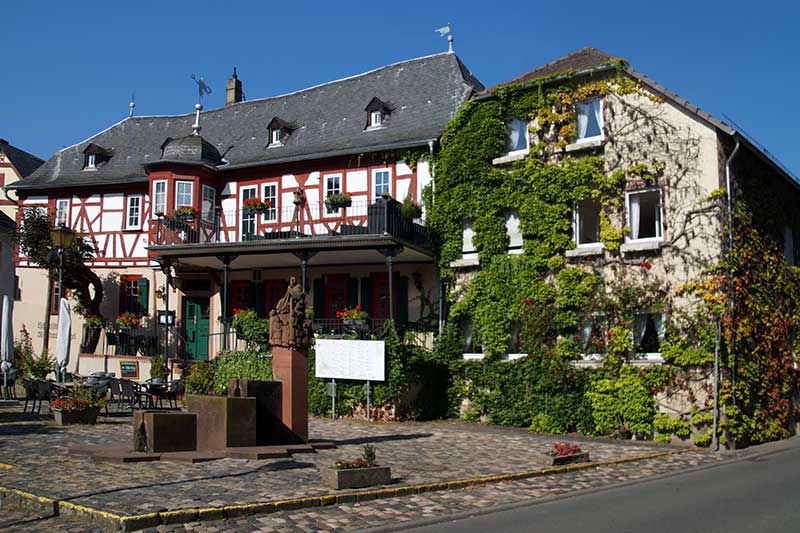 auch Mainzer Erzbischöfe residierten. Natürlich ist Kiedrich seit Jahrhunderten eng mit dem Weinbau verbunden, wovon historische Gutshöfe, gastfreundliche Gutsschänken, Straußwirtschaften und Restaurants bis heute zeugen. Schließlich liegt es auch in unmittelbarer Nachbarschaft zum weltberühmten Zisterzienserkloster Eberbach, das den Weinbau im Rheingau einst weit verbreitete. Jedes Jahr im Juni feiert Kiedrich sein großes Rieslingfest und Brautpaare, die sich im Kiedricher Rathaus das Ja-Wort geben, erhalten sogar einen eigenen Rebstock im „Weinberg der Ehe“.