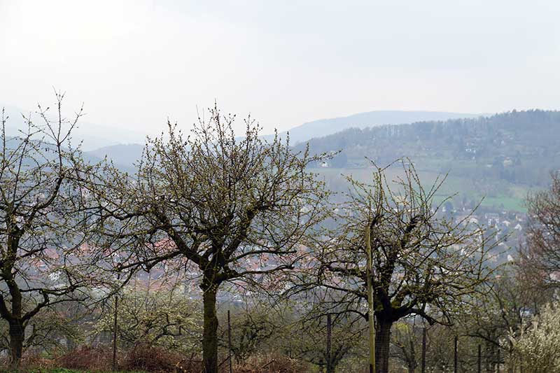 nur wenige Meter langen Pfad auf einen Wiesenweg zu gelangen, der Sie entlang von Feldern und Kirschplantagen mit tollem Blick auf Witzenhausen, den Ortsteil Ermschwerd sowie die Werra talabwärts bringt. Am Ende der Kirschplantage wechseln Sie nach rechts auf den Asphaltweg, unterqueren die Bahngleise und biegen direkt danach nach rechts in den Berlepschweg ein. Sie befinden sich jetzt im Witzenhausener Ortsteil Bischhausen, der von der Kernstadt nur durch die Werra getrennt ist. Der Bahnhof Witzenhausen-Nord liegt nur etwa 300 m entfernt. Gehen Sie die Sudetenstraße geradeaus, dann zweigt links ein