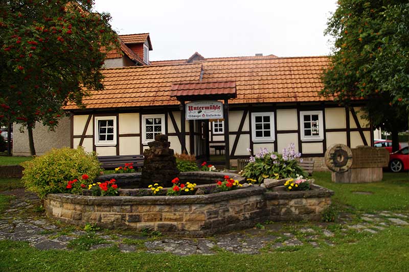 auf einem Feldweg, der bis zum nahen Waldrand führt. Zunächst geht es nach links ein Stück an diesem entlang, bevor der Weg etwas tiefer in den Wald führt. Sie gelangen an ein paar Fischteiche, überqueren hier die Landstraße L3245 nach links sowie den Lautenbach und haben jetzt einen langen und kräftigen Anstieg zunächst auf einem Asphaltweg, dann auf einem breiten Waldweg vor sich: auf ca. 1,3 km müssen ca. 160 Höhenmeter bezwungen werden. Dann lässt es sich an der Schiefersteinhütte (Schutzhütte) verschnaufen. Hier an der T-Kreuzung trifft der X5 H auf den mit X8 markierten Barbarossaweg. Beide Wege führen nach links fort und verlaufen ein paar Kilometer gemeinsam. Um in Röhrda zu übernachten, biegen Sie nun aber auf den nach rechts abzweigenden X8 ab und folgen diesem beständig bergab in den ca. 1,8 km entfernten Ort. Kurz nach dem Ortseingang befindet sich der Landgasthof „Zur Untermühle“.